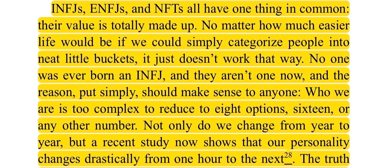 Iāve taken the Myers-Briggs many times throughout my life. I get different outcomes nearly every time I take it. The truth is, we change throughout our lives ā and also we change from moment to moment based on the situation weāre in.